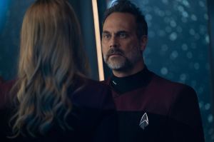 Also, while returning to the Enterprise D, the writers made sure to keep all the non-TNG actors busy so as to not muddy the waters when reintroducing the crew to their ship. Seven of Nine and Raffi were busy fighting off Borg while (as explained in a previous writing here) my favorite new character this season, Captain Liam Shaw was killed off by the Borg. Rest in peace, Captain Shaw…I really wanted so much more for your character! Fittingly, with his dying breaths, he handed off command of the USS Titan-A to “Commander Seven” as he finally addressed her as her Borg designation. As I stated previously, I loved his character & understood his point of view in all of this craziness that Picard & Riker brought to his ship. I’d have really enjoyed a spinoff series, starring him, Commander Seven, and their crew onboard the USS Titan-A. I think the dichotomy of the relationship between he and Seven would have made for an interesting series as the two grew to work together. In my idyllic series with these two, I have them start off as a bit of oil & water, but when needed to work together to overcome foes, operations-wise, they work together fantastically. Certainly a different approach for a Star Trek series!