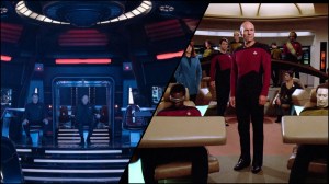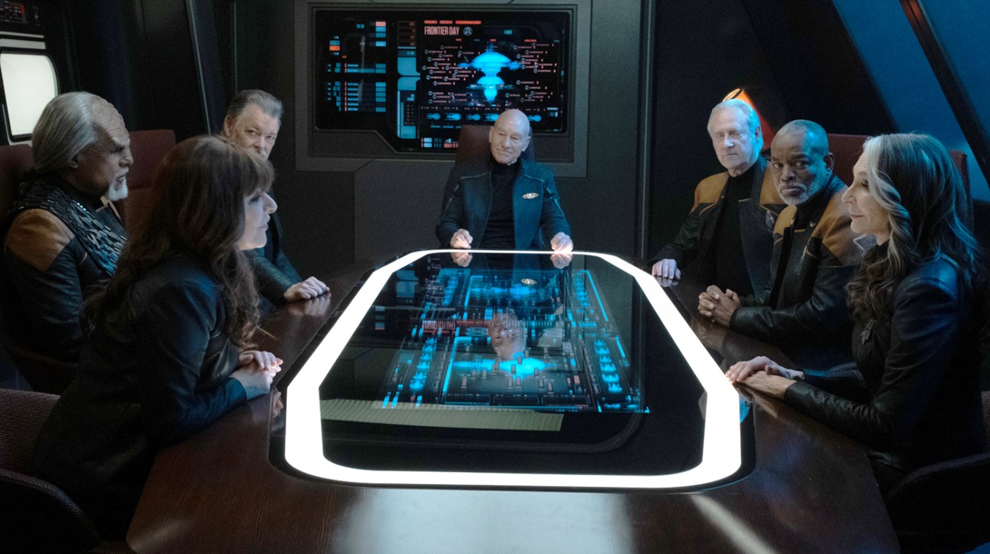 In order to survive this takeover, Picard & the rest of his bridge crew escape in a shuttle and retreat back to the Federation Fleet Museum, where it’s curator, Commodore Geordi La Forge, has been working on a personal project for the last 20 years in hangar bay 12. When they arrive at the Fleet Museum, the personal project is revealed to be the rebuilt Enterprise-D. When revealed, it’s truly an amazing sight! When the crew board the ship and start her up, hearing the familiar voice of the late Majel Barret as the computer was a truly emotional moment for me. It’s even evident in the way that they show Picard slide his hand over the panels of the computer consoles that there’s almost a romance between him and his former ship. It “gets ya in the feels” is the best way I can describe those scenes, because it triggers all those great feelings of nostalgia, looking back to a better time in Trek fandom, when everything was newer and not so “dark” as I’ve described a lot of the new Trek series on Paramount+. Especially the USS Titan-A from earlier in this same season, all the corridors, crew quarters and main bridge are all so dimly lit. How these actors dealt with seemingly acting in the dark is something else to me. I suppose the darkness is supposed to make things look more futuristic, but I just can’t see wanting to explore space in a dimly lit ship. It may also be my own problems when watching the show while on a well-lit train, even though I turn the brightness on my phone up all the way, oftentimes I find myself straining to see the picture because the scenes are all so dark. I’m sure it would be better if I were sitting in my living room at night watching it in the dark on a large television. Personal aesthetics preferences aside, it was nice to see an old friend again.