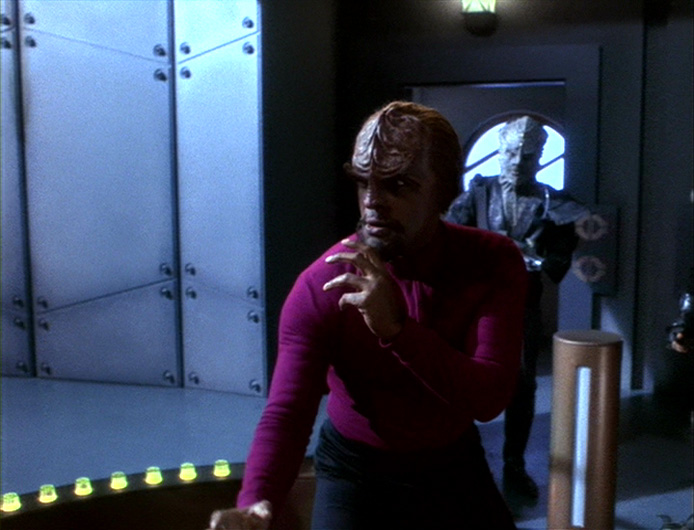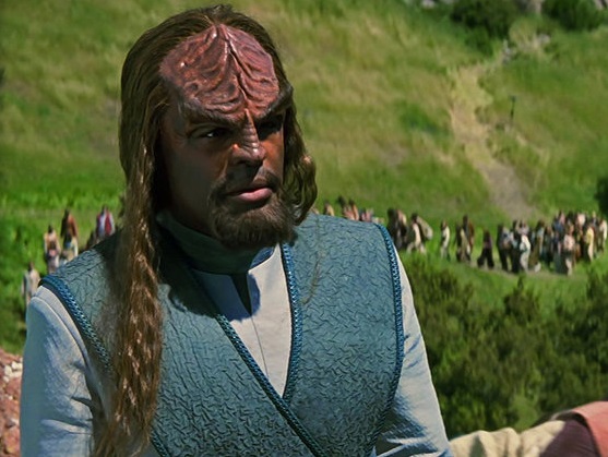 There’s just so many times while with the crew of the Enterprise (including the motion pictures — especially Insurrection) that he’s just made to look foolish. From being electrocuted while making an idiotic face, declaring that he’s “NOT a Merry Man!” in a Q fantasy world to taking a mud bath with Alexander and Lwaxana Troi. It should also be noted that upon his return to the Enterprise for the motion pictures, that the TNG writers pick up right where they left off, putting him through Klingon puberty again in Insurrection. If it weren’t for Deep Space Nine, I’d seriously wonder why they had to make Worf’s character a Klingon at all.